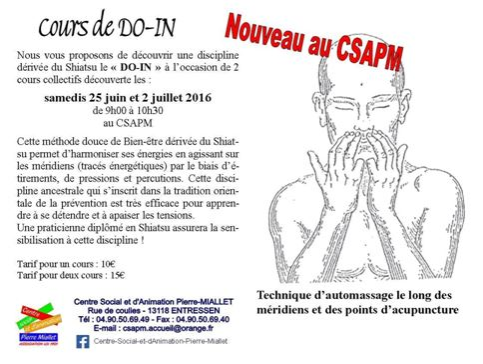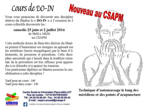 Suite aux deux cours découverte du Do-In proposés dans la salle polyvalente du Centre Social et d’Animation Pierre MIALLET d’Entressen, les 25 juin et 02 juillet 2016, le Do-In fait sa rentrée à la Maison de Quartier de Trigance à Istres à partir de septembre 2016.